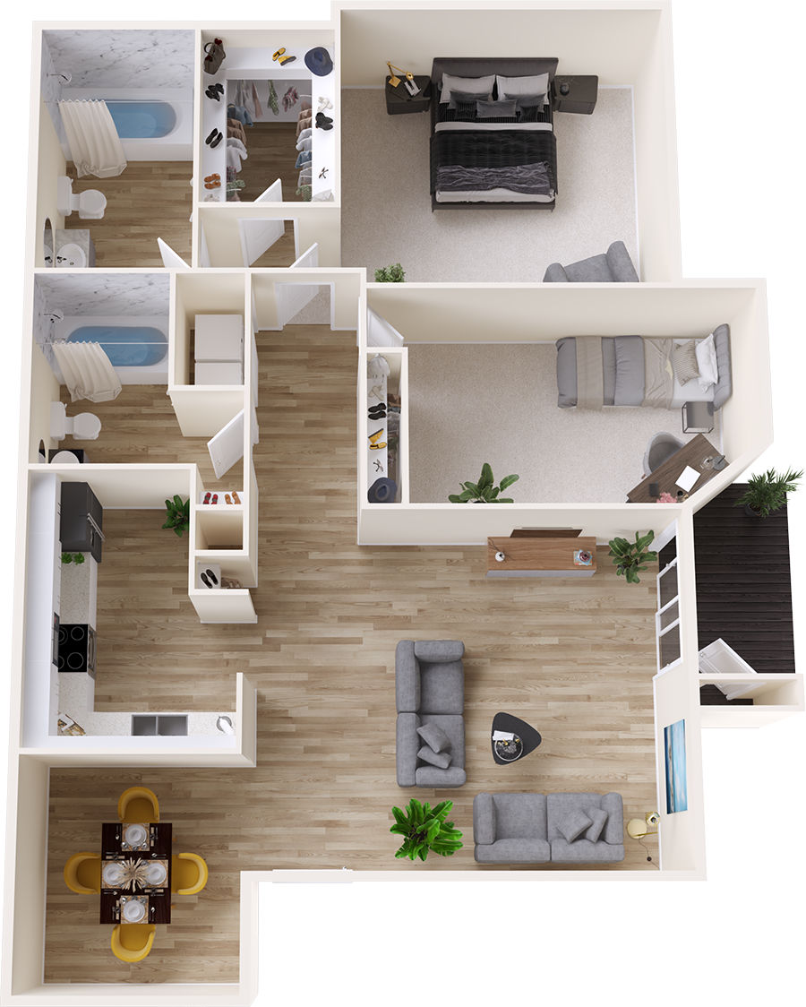 This is our two bedroom, two bathroom floorplan with 935 square feet of living space. This apartment features a balcony or patio, storage and linen closets, a walk-in closet, and a kitchen bar area. Please call a member of our friendly leasing staff for more information!